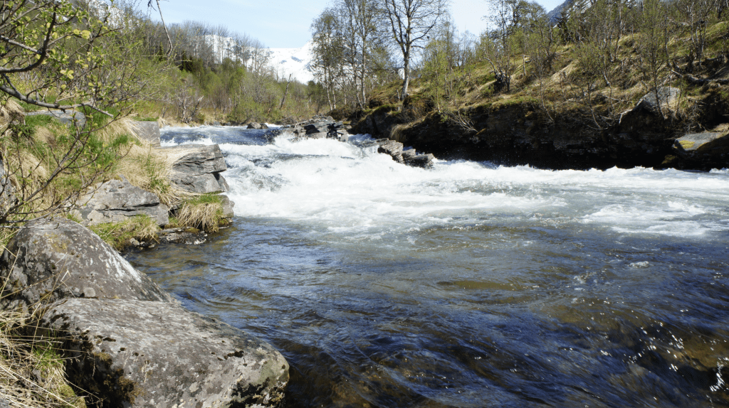 Straks nedenfor storbrua, yttersida elva, var det ett litt mer stilleflytende parti på kanskje 20 meters lengde. Det var første stoppested for oppgående sjørøye. Fikk mange fine fisk der med mark og dubb..