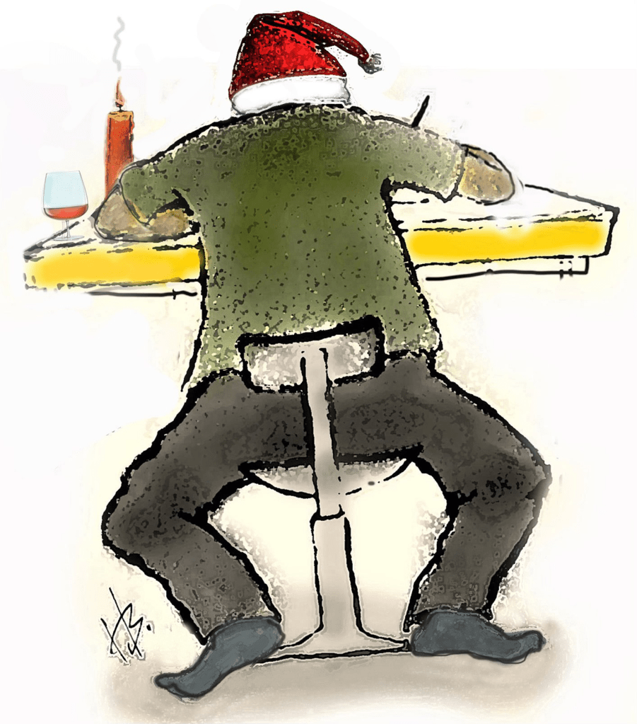 Denne illustrasjonen skal forestille undertegnede idet han med vemod skriver sitt siste julekort i begynnelsen av desember i fjor. Har tatt på nisselua for å prøve å komme ihvertfall i litt julestemning. Men jule- og nyttårsfeiringen er over – og nu er det her nord tid for å konsentrere seg om vinterlige aktiviteter som snømåking og fyring i ovnen.