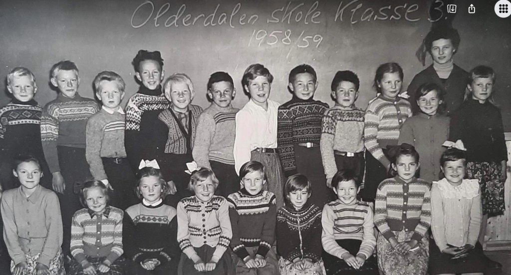 Fra venstre bak: Sverre Nikolaisen, Kjell Albrigtsen, Magnor Mathisen, Gunnar Petter Hansen Lie, Jostein Pedersen, Steinar Hansen, Rolf Petter Slettli, Leif Ballovarre, Alf Steinar Eriksen, Liv Pedersen, Lærer Vesla Simonsen, Jenny Ballovarre, Gunnlaug Olderdal. Første rekke fra venstre: Eldbjørg Bergheim, Dagmar Pedersen, Anne Sofie Nilsen, Elsa Solberg, Torveig Molund, Brit Johansen, Eva Johnsen, Lisbeth Albrigtsen og Rigmor Rismo. Flott gjeng! Takk til Lisbeth Albrigtsen for bildet!