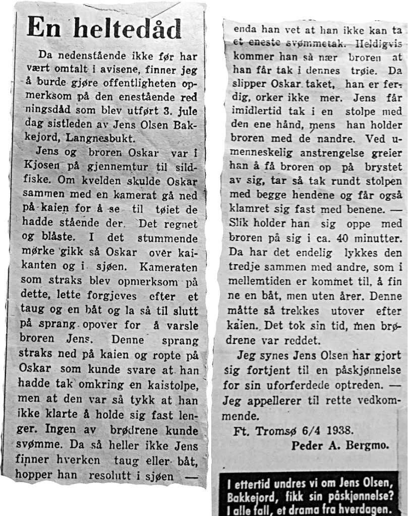 Fant dette i en konvolutt. Vet ikke om du kanskje har dette. Kjenner ikke til disse som er nevnt, unntatt skribenten, gammel Bergmo. Vet heller ikke hvilken avis dette var, antakelig enten Nordlys eller Tromsø.