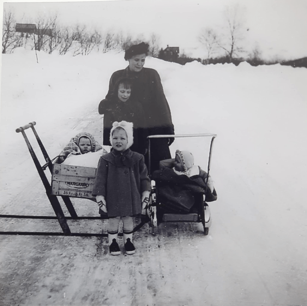 Lilly Tokle Garfjell (1918-2003) sammen med de fire eldste døtrene sine vinteren 1953: Lillian, Vigdis, Sonja og Laila, sistnevnte oppi margarinkassa.