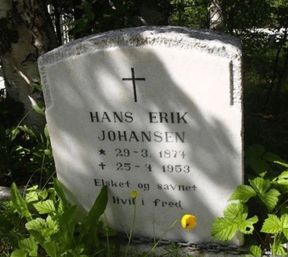 Hans Erik døde i slutten av april 1953. Han ble gravlagt ved siden av sin datter Svanhild. Senere ble kona Oline liggende ved siden av på familiegravstedet i Olderdalen.