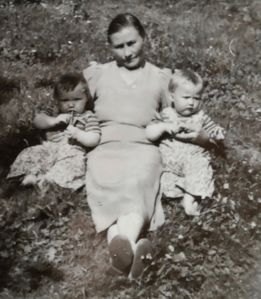 Oline Johanna Kristine Johansen (1895-1961) og sine tvillingbarnebarn Laila og Sonja (t.h.) sommeren 1953.