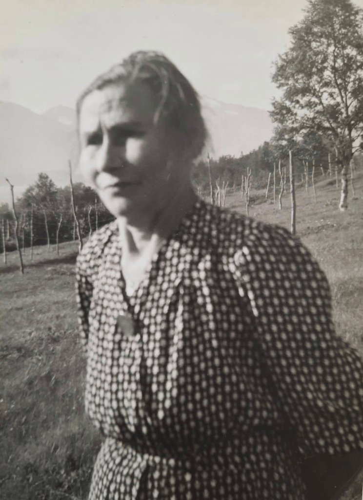 -5a. Anna Ovedie Hansen (Haugen, 1900-1971), g.m. Hilmar Georg Joakim Jensen (Haugen, 1893-1961) fra Olderdalen. Anna gikk bort 70 år gammel. Bosted Soleng, Olderdalen.