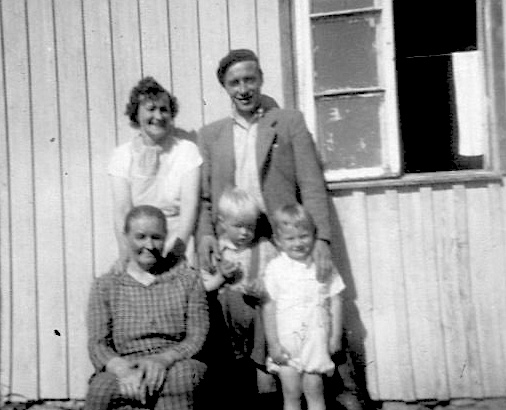 Bak Dagny og Øyvind Soleng. Foran ser vi bestemor Rasmine med barnebarna Svein og Dagfinn.