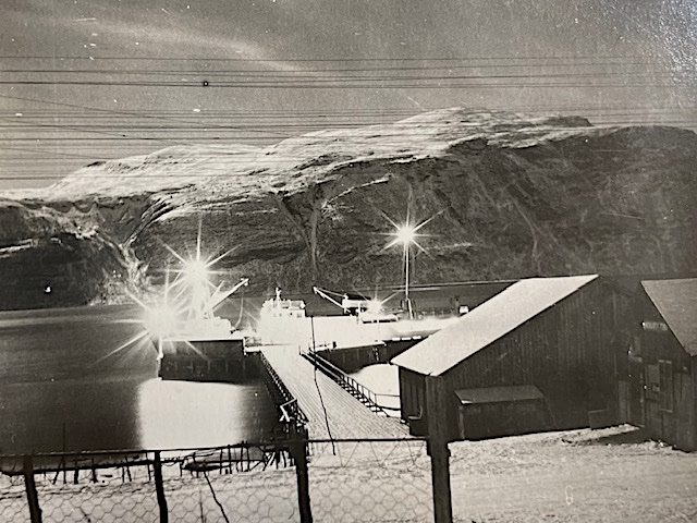 Vi ser den gamle dampskipskaia i Olderdalen, i måneskinn. Til venstre ligger butikken til «Hans Persa», ved siden av det gamle pakkhuset fra krigens dager.