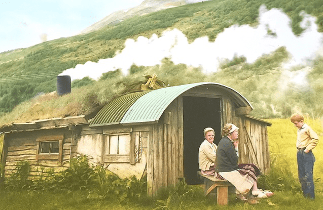 Slik så badstua til Stefanus Pettersen ut etter at Kulturhuset i Olderdalen ble reist. Bygget skal ha blitt tatt ned og tømmeret merket med tanke på gjenoppføring og restaurering. Dessverre ble badstua likevel aldri satt opp igjen i Olderdalen. Foto: Ukjent