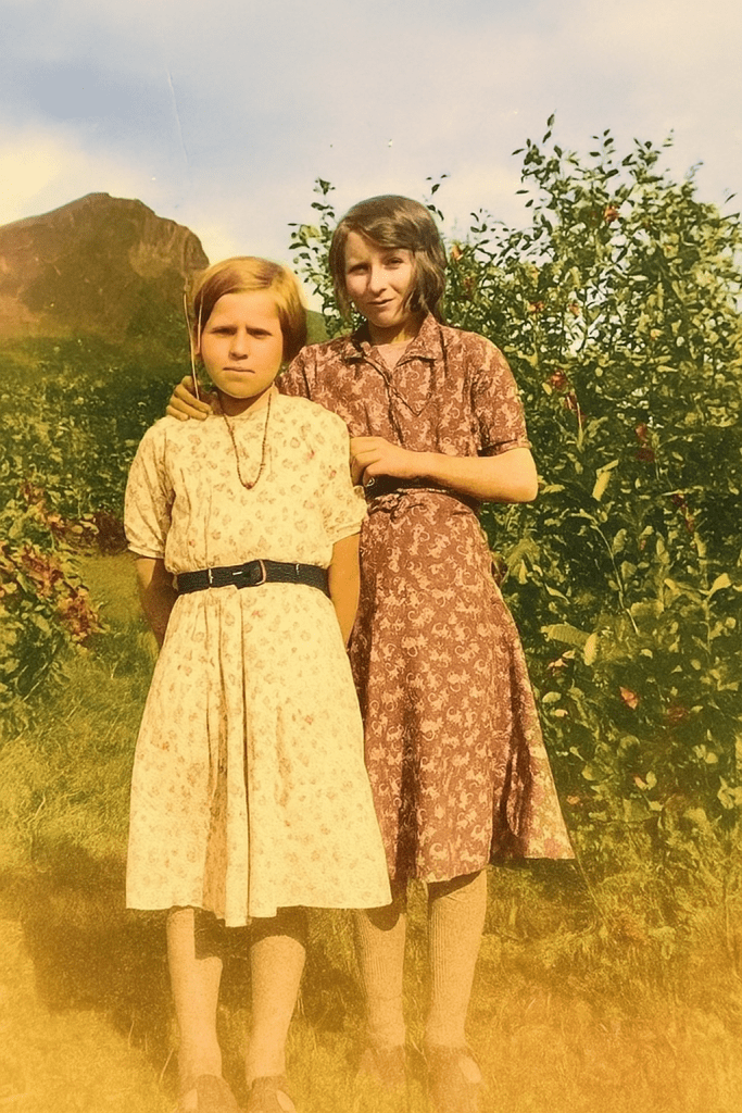 Her er et bilde av bestevenninnene Tordis Jensen og Agnes Pedersen Mathisen. Agnes druknet tragisk i Reisaelva. Tordis reiste tidlig til Sverige, hvor hun senere etablerte seg med mann og barn.