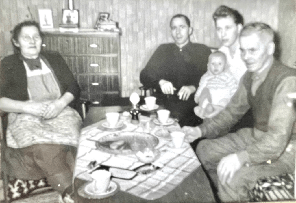 Anna, Peder, Agnor, og Peder Mathisen samlet til ved kaffebordet. Fine folk.