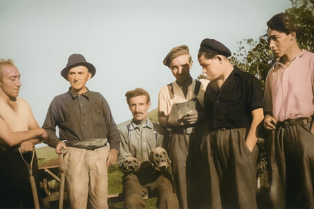 Under veiarbeid mellom Olderdalen – Birtavarre i 1946 ble det funnet flere levninger etter den gamle «finnekirkegården» på Barslett. Vi ser arbeidsgjengen fra venstre: Paul Horst Mikkelsen, Ole Martinsen, Peder Larsen med to hodeskaller, Ludvig Hansen, Erling Jensen og Arne Hansen. Foto: Erling Jensen. Redigering: Svein Soleng