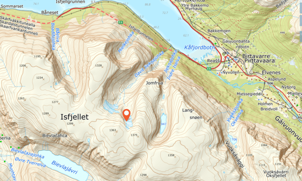 Ligger ved en liten isbre/skrent like ved de to toppene (1363 og 1375) på Isfjellet. n724375e7718241@25833. UTM – koordinat – (anslått ved interpolering): 1231,6 moh