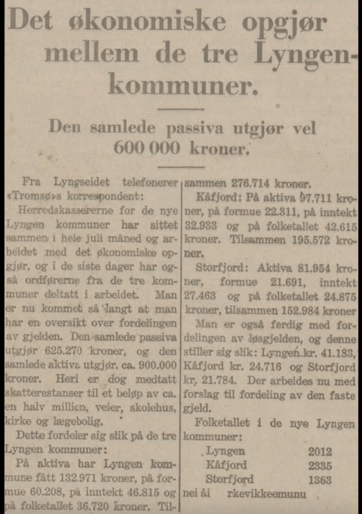 - Viser det økonomiske oppgjøret mellom de tre Lyngen-kommunene etter at gamle Stor-Lyngen ble til tre selvstendige kommuner i 1930.