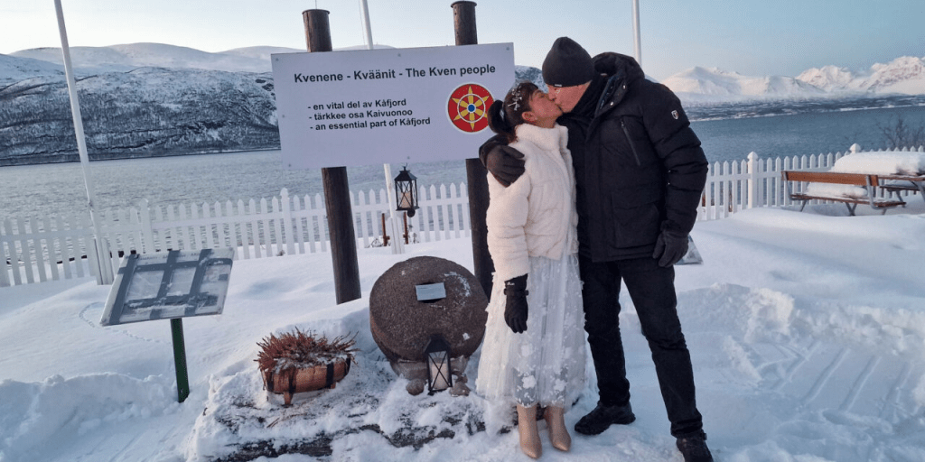 En symbolsk vielse i kvenparken i vinterdrakt.