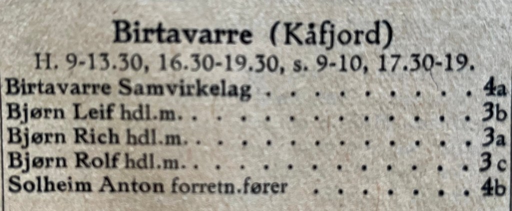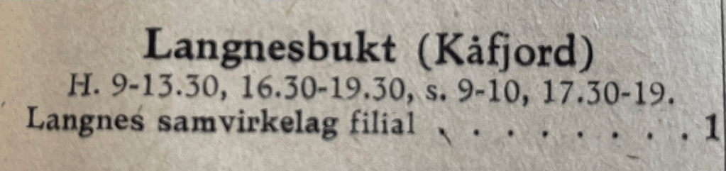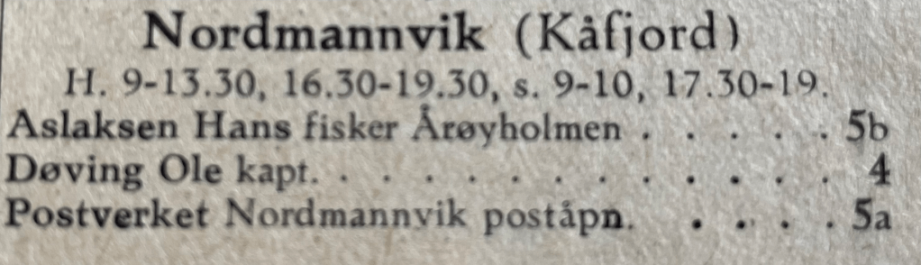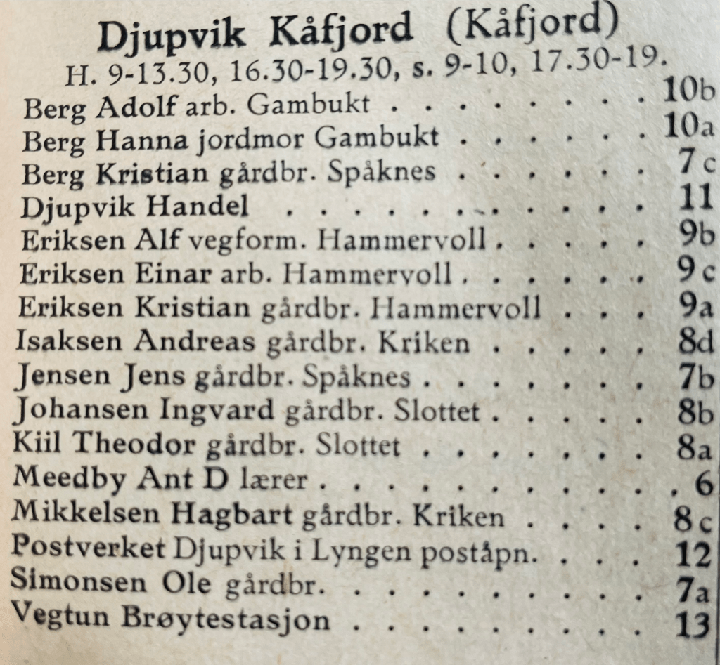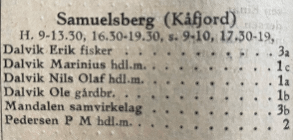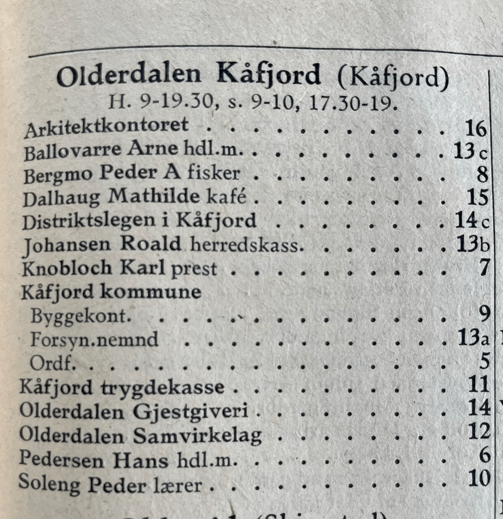 Telegrafstation.Vi ser at stasjonen i Olderdalen hadde åpent fra 09.00 til kl. 19.30 på hverdager og på søndager 09.00 til klokken 10.00. Og 17.00 til kl..19,30. Hvem var handelsmann Arne Ballovarre og hvor hadde han butikk? Vi ser at kun Langnes samvirkelag hadde egen telefon. Hvem drev stasjonen?Også i Birtavarre hadde stasjonen lange åpningstider. Kåfjorddalen hadde tydeligvis kun Telegrafstasjon.På Samuelsberg ser vi at Dalvik-folket hadde hver sin telefon + Samvirkelaget og handelsmann P.M. Pedersen. Jeg fant ingen telefoner lenger oppi i Manndalen.Ser at fisker Hans Aslaksen, Årøyholmen lå under NordmannvikI Djupvik var det 16 telefoner, like mange som i kommunesenteret Olderdalen. Ser at lærer Ant. D. Meedby står oppført med telefon, men han døde vel i 1946.