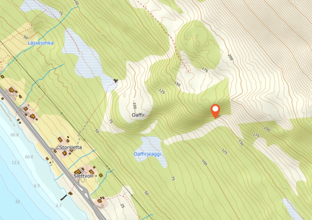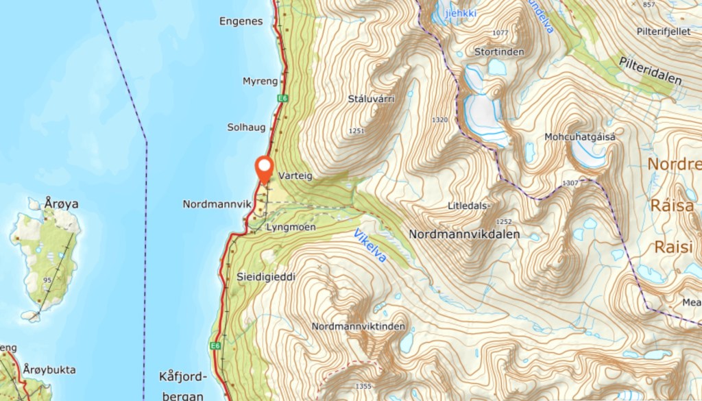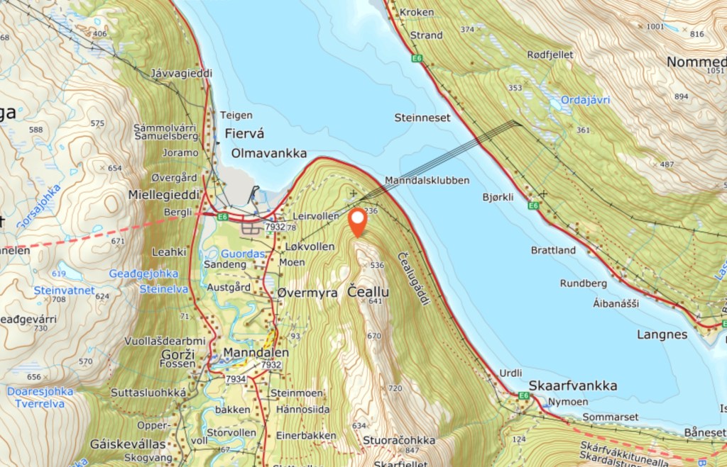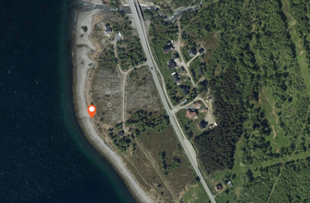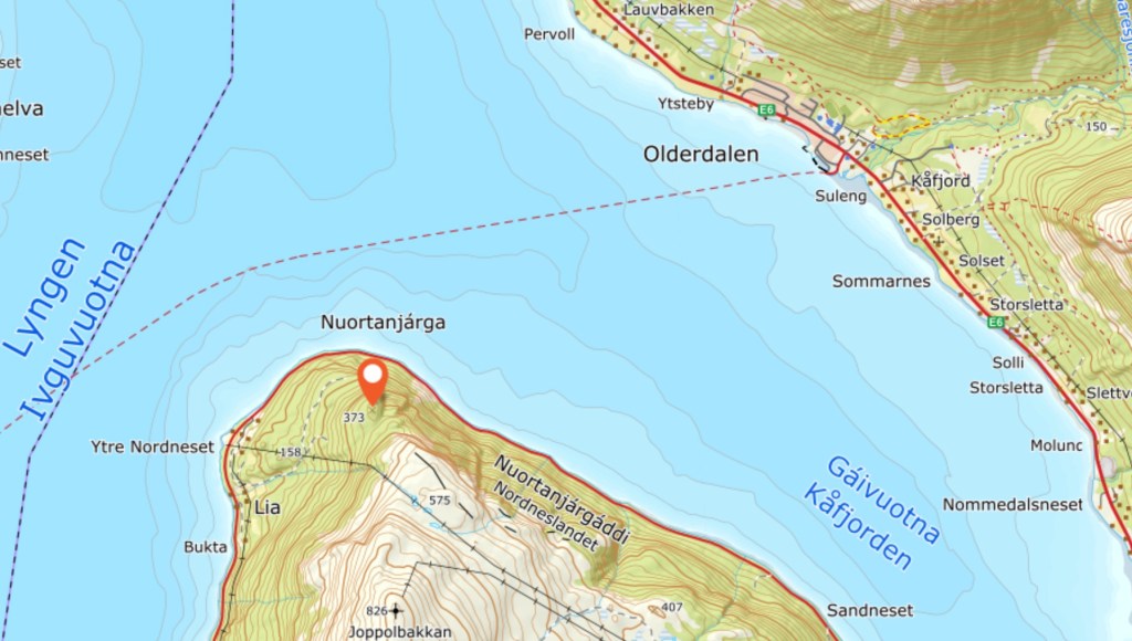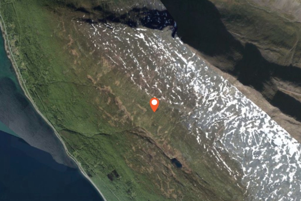Markert nes og fjellformasjon. Det røde merket på kartet er Ørnfloget på Nordnesodden.
