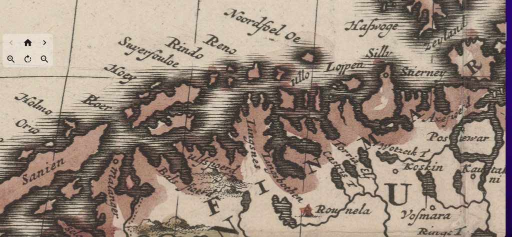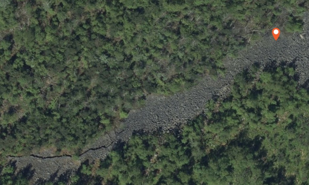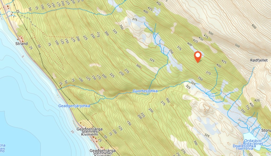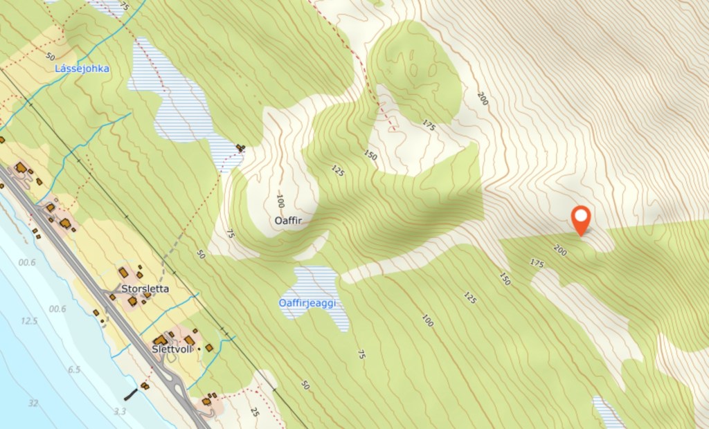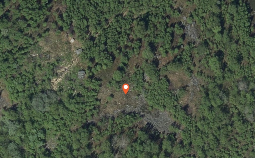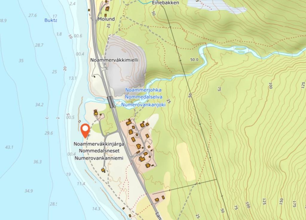 Markert nes og fjellformasjon. Det røde merket på kartet er Ørnfloget på Nordnesodden.