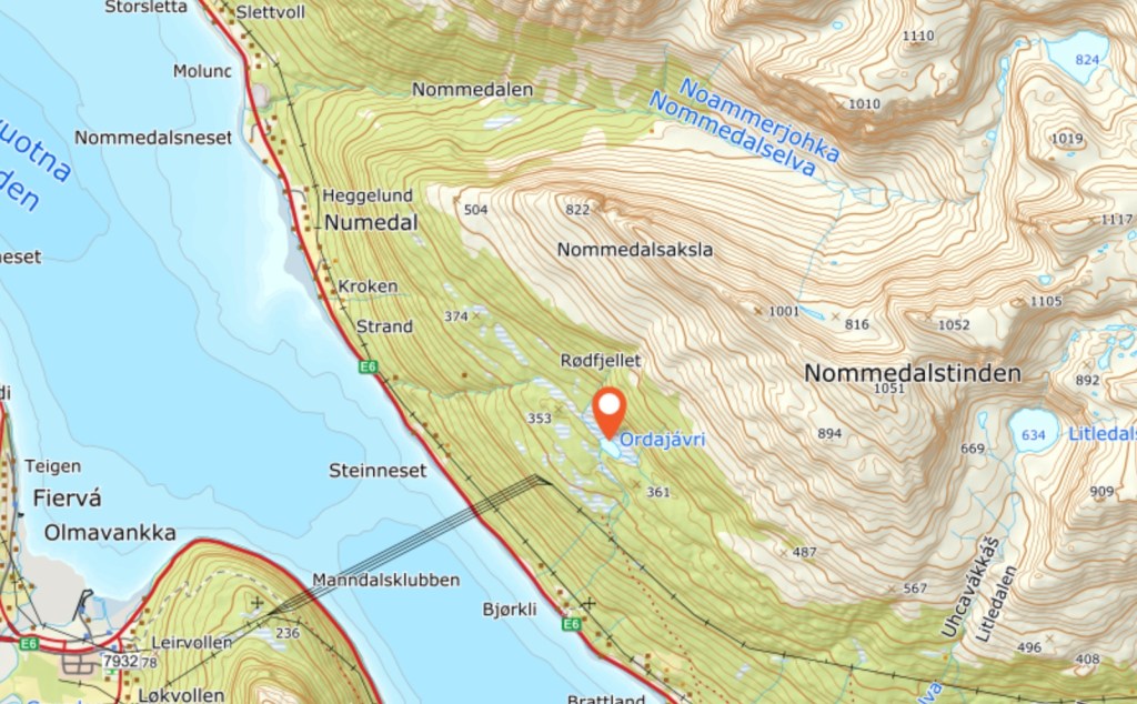 Orda=Skoggrense. Vannet ligger under Nommedalstinden.