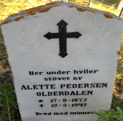 Alette Pedersen ble født den 17.september 1872. Hun var søster til kjøpmann Hans Pedersen. Alette var enslig hele sitt liv, men hun fant stor glede i å hjelpe andre. Hun bodde i et lite hus ved siden av butikken til sin bror. Det sies at de to var meget forskjellig og hadde ulikt syn på flere samfunnsspørsmål.