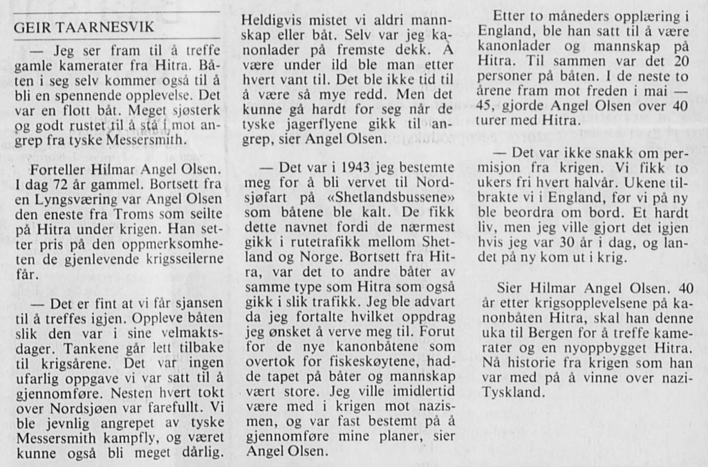 Jeg gjorde det for Norge og av hat til nazistenes krigserklæring..Det sier Hilmar Angel Olsen om sin krigføring mot nazismen på kanonbåten «Hitra» Nordlys 14.07-1987