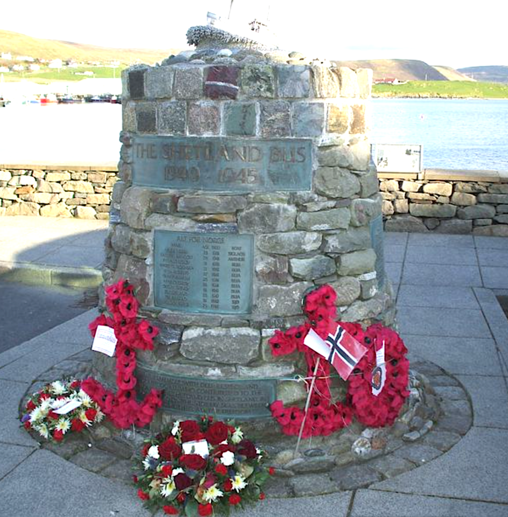 Minnestein over Shetlandsfarere i byen Scalloway på Shetland