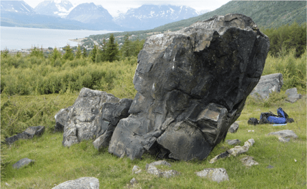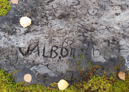 På Eirat (bakke under fjell) ligger Navnestein. Allerede på 1920-tallet begynte de første å risse inn initialer og navnet sitt i steinen. Hvorfor akkurat denne steinen?, har mange spurt. Det kan jeg ikke svare på… Men vi vet at barn og unge, men også voksne, har risset inn navnet sitt i mange år. Med hammer og spiker var det mange timers arbeide.. På steinen ser vi at Valborg (Pia) har gått hardt ut, men hun har gitt opp før G ´en var på plass.