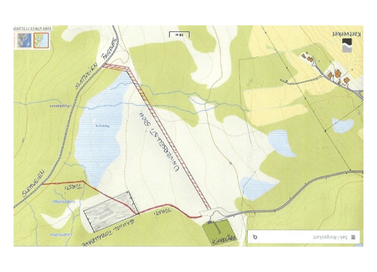 Den røde skraverte rette linja er kommunen og Ojf ́s forslag til universell sti. Dagens tursti er merket med en rød enkel stripe fra kirkegården, langs plantefeltet, over den gamle fotballbanen, og en 20 meter lang kloppegang over Solbergmyra. En gangsti som har vært der i mange år.