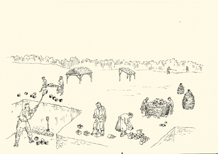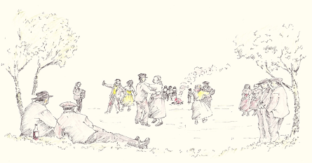 Tegningen viser livet på Slettveien en sommerdag fra 1920