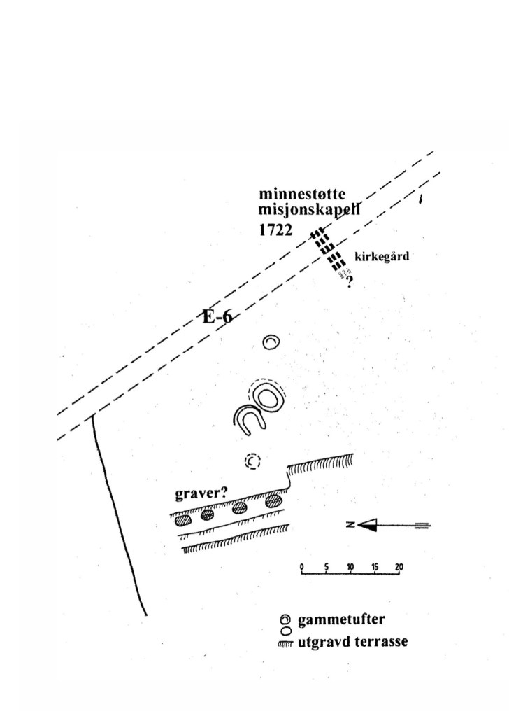 Skissen under viser i tillegg to store gammetufter og noen gravrøyser?