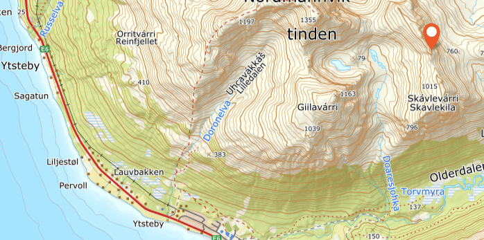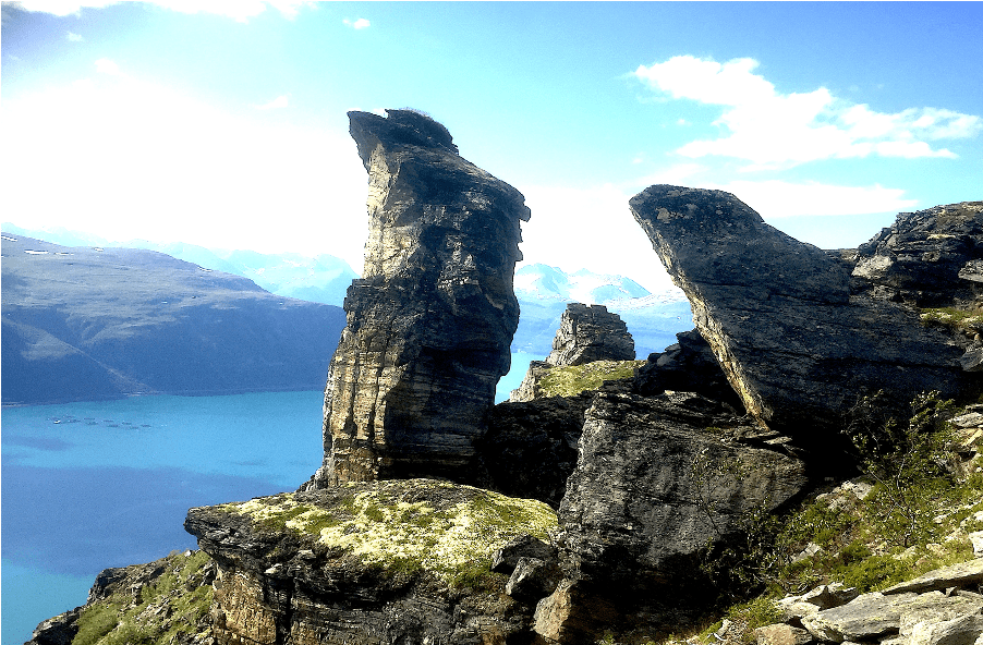 Fjellets formasjon Áɲubealgi. Norsk Kjeiptind. Fjellet form kanskje ligner den en keip, tollepinne. Vi burde samlet inn alle `meer` i Kåfjorden