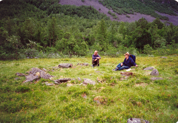 Fortsatt kan ses rester av et steingjerde og tufter etter gammer.Tormod Albrigtsen og Hedmund Antonsen er hyret inn som kjentmenn under en registrering Lene Antonsen gjorde i dalen.En innhegning der kalvene ble satt for unngå at simlene ble pattet tom for melk. Foto Lene AntonsenVed Bárdnagieddi har det foregått melking av rein.