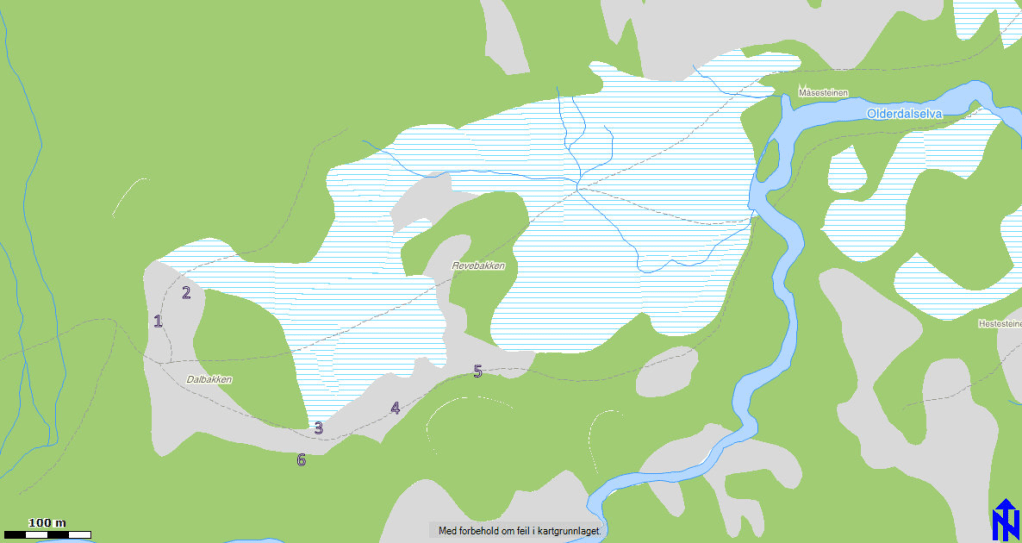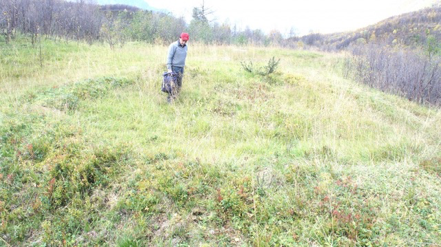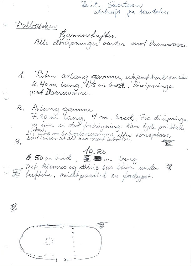 Slik kunne den siste gammen på Dalbakken sett ut. Tegnet av Leidulf Olsrud.Arkeologen på befaring.Det var torvmyrer på begge sider av elva.Nr. 1, 2 og 3 er de eldste tuftene på Dalbakken. Tuften nr.6 er på ca.. 80kvm. Nr 4 og 5 er de to siste som sto på Dalbakken. (1878)Berit Sivertsen gjorde en fortegnelse over tuftene på Dalbakken rundt 1980. Fant mye interessantKladd av Tufter på Dalbakken av Berit Sivertsen for Sametinget