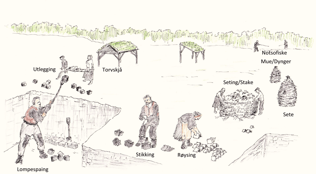 Leidulf Olsrud har tegnet de forskjellige prosessene på ei torvmyr. Tre store grunneiere lot bygdefolket stikke torv på sine eiendommene sine. Det var også torvmyrer på andre siden av elva. Faktisk torv av høy kvalitet. Svarttorv.Gode torvspader var et viktig redskapDalbakken var den største torvmyra i dalen. Men, den beste kvaliteten fant man på innersida elva. Skikkelig god svarttorv.