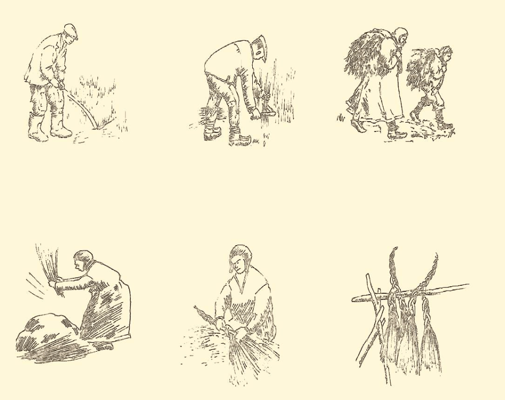 SennegressStore sennagressmyrer som er i ferd med å gro igjenSennegress = Suoinnit eller gámasuoinnit. Øverst 1 og 2) : Suidnet = skjære og tilberede. Nede til venstre 3): Šluvgit (suinniid) = Slå nyskåret gress./ bilde 5 og 6) Bilgádit = Flette sennegressknipper sammen to og to.