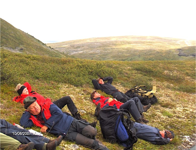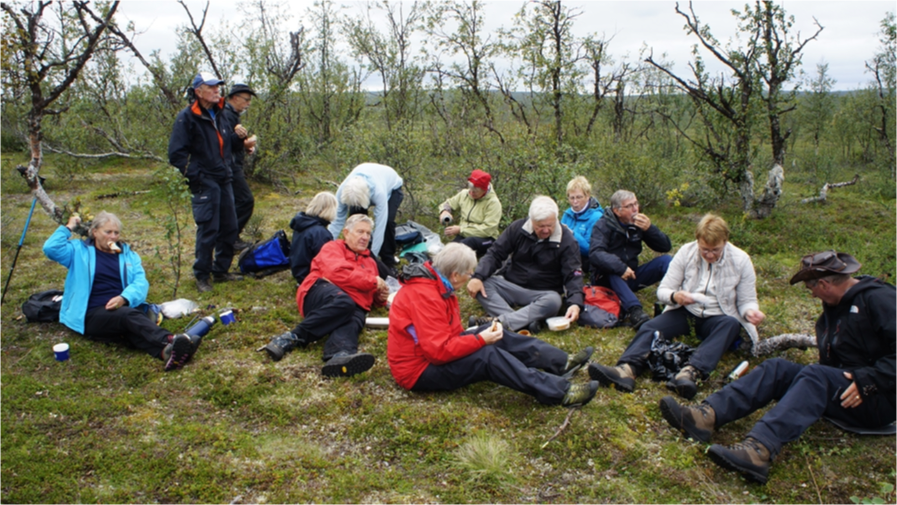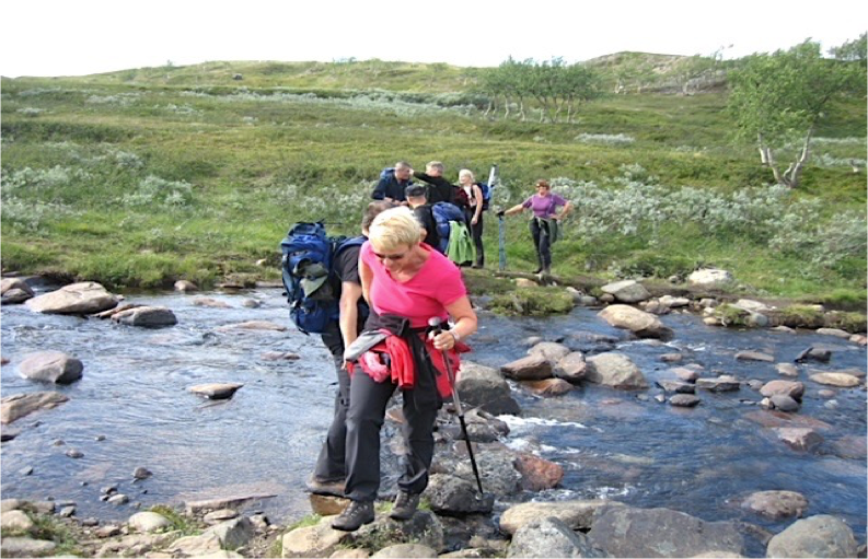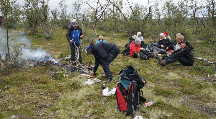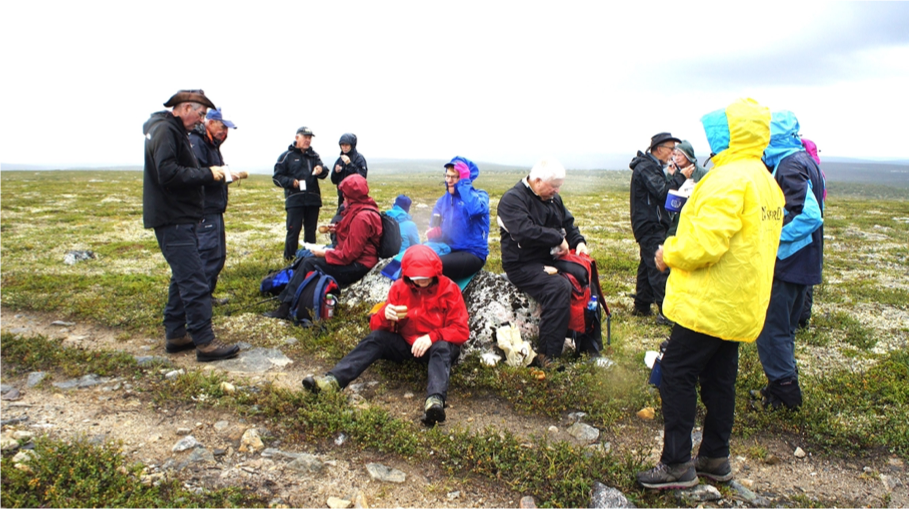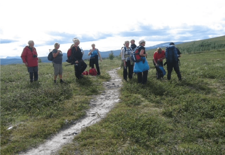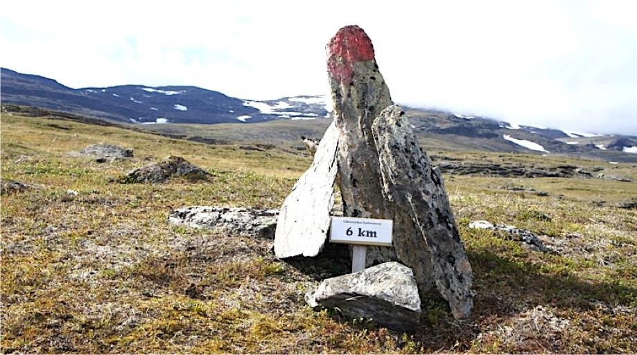 Vi krysset grensen mellom Norge og Sverige. Etter et besøk på Sveriges nordligste fjellstue, «Peltsastugan», fortsatte vi langs europas lengste morenerygg som strekker seg 7 kilometer mot den norske grensen. Stien følger toppen av ryggen, som har bratte og høye sider. På begge sider av ryggen ligger vakre gress- og lyngsletter, og lengre borte skimter vi høye fjell.