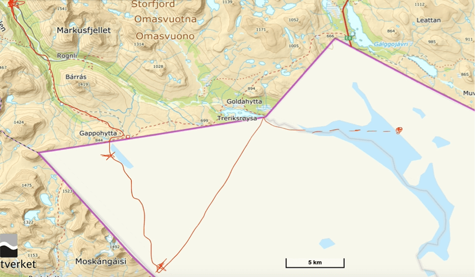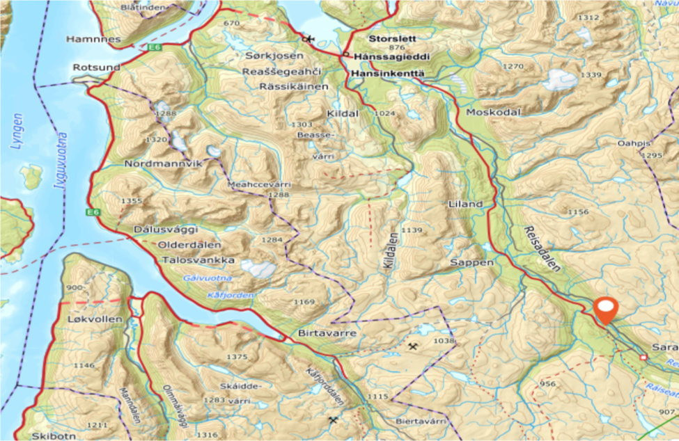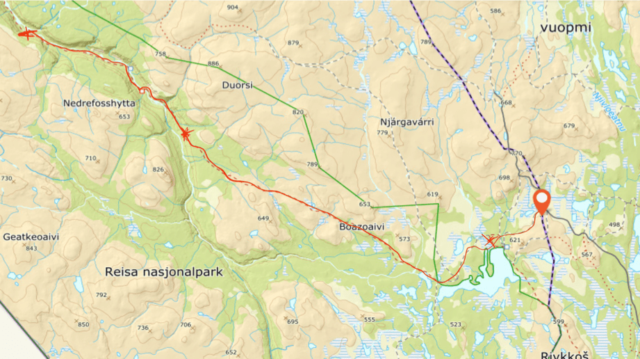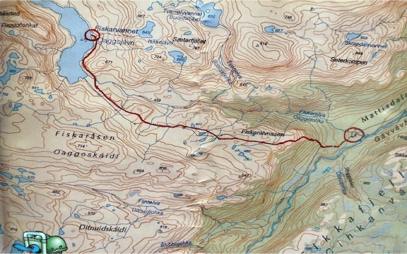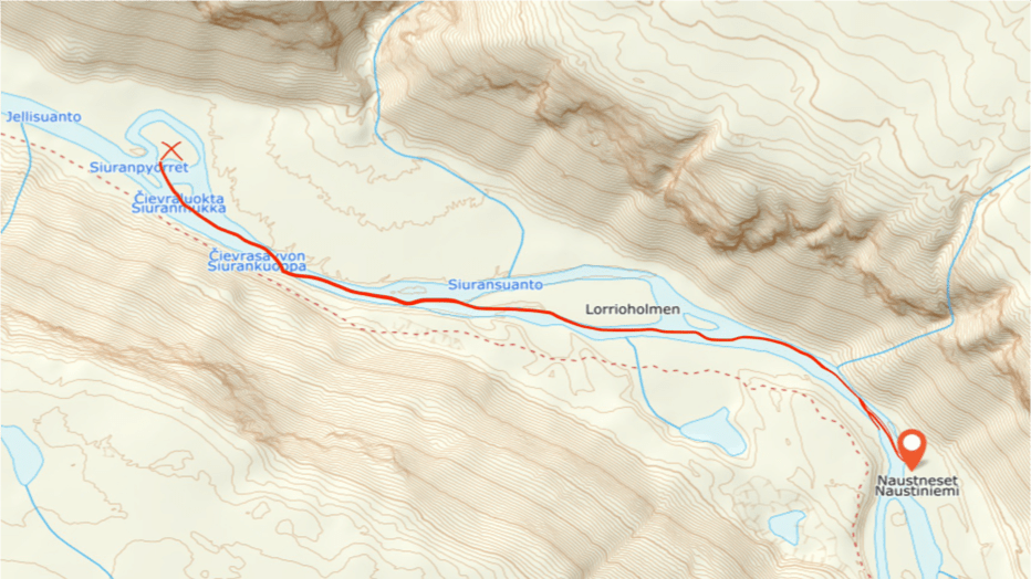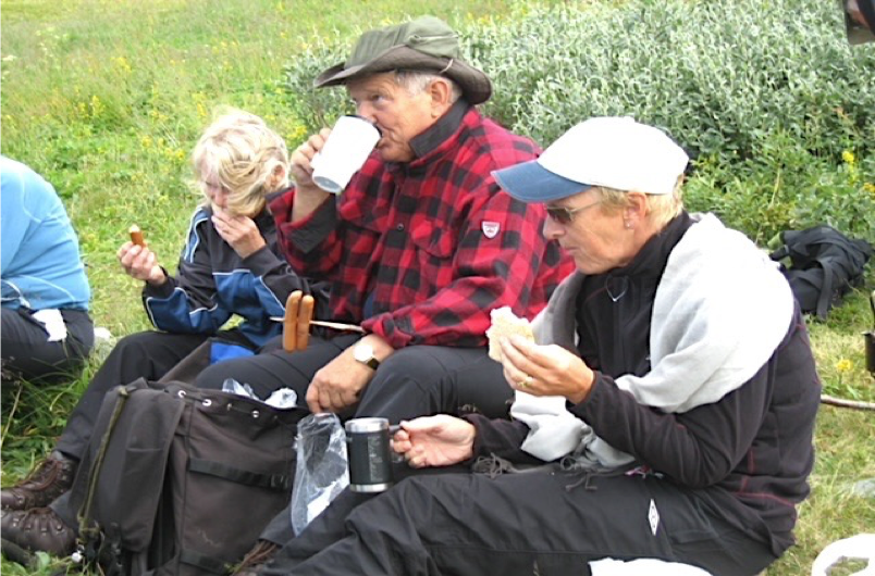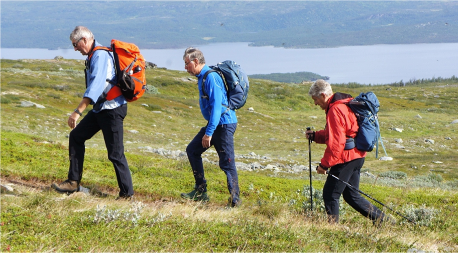 Vi krysset grensen mellom Norge og Sverige. Etter et besøk på Sveriges nordligste fjellstue, «Peltsastugan», fortsatte vi langs europas lengste morenerygg som strekker seg 7 kilometer mot den norske grensen. Stien følger toppen av ryggen, som har bratte og høye sider. På begge sider av ryggen ligger vakre gress- og lyngsletter, og lengre borte skimter vi høye fjell.