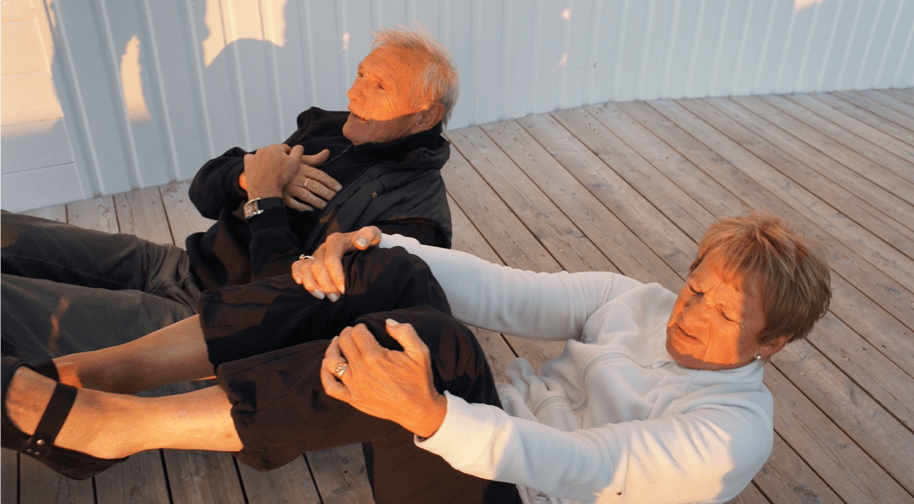 Forsvarskjempen Jan Rolandsen har fortsatt magemusklene i orden. Berit sliter.