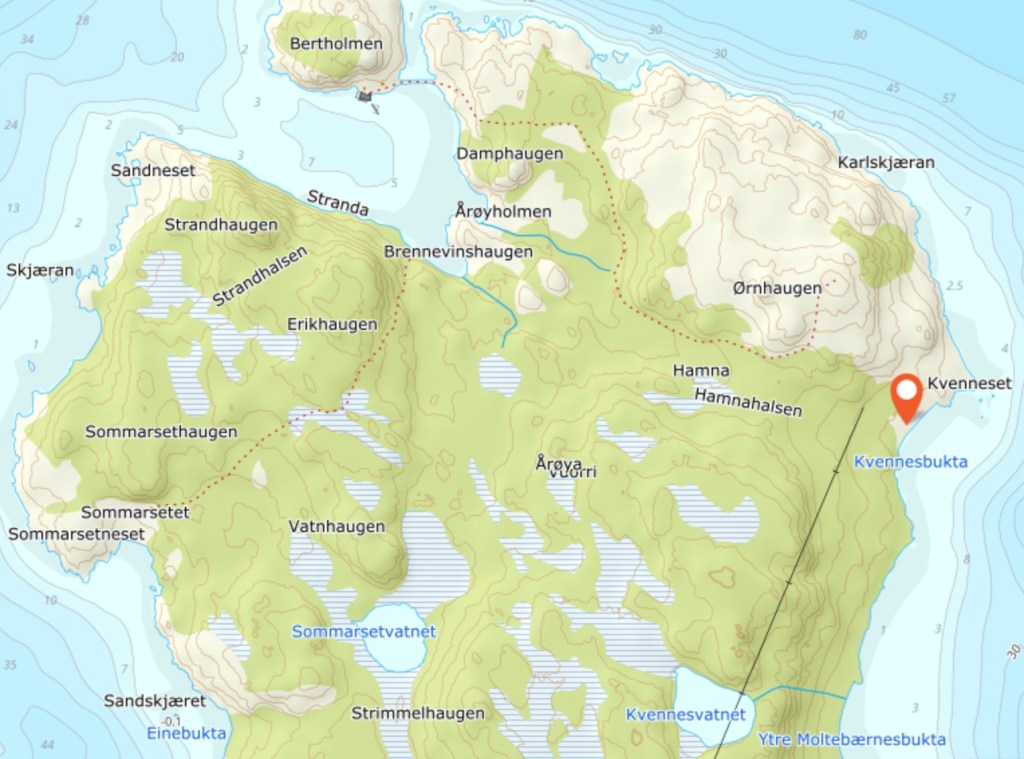 Øy i Lyngenfjorden med kun norske stedsnavn. Uvanlig, men slik er det. Vi kan se navn som Brennevinshaugen, Damphaugen, Strimmelhaugen og Ørnhaugen. I tillegg ser vi navn som Kvenneset, Kvennesbukta og Kvennesvatnet. Det samiske navnet på Årøya er Vuorri og det kvenske er Saari.