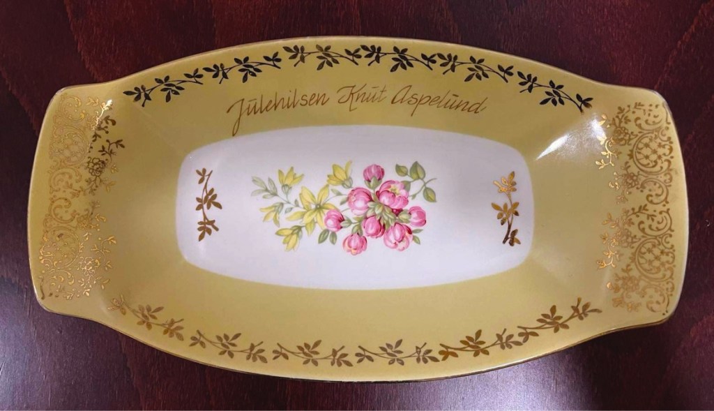 Tidligere var det vanlig med julehilsen fra nærbutikken. Det kunne være et askebeger, kopp el. På bildet ser dere et nydelig fat i ekte Figgjo flint fra Knut Aspelund, Olderdalen.